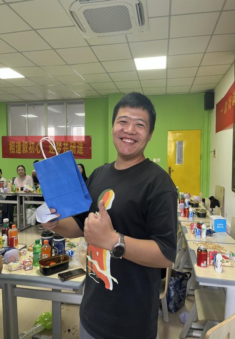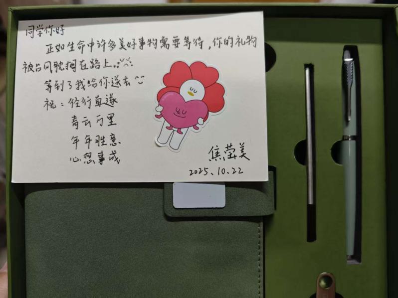 活动伊始,“初心盲盒” 礼物互换环节温情开启。同学们将精心准备的礼物依次摆放,大家随机抽取,互换礼物,从海南特色的零食大礼包,到印有自制香薰挂件,从奶油蛋糕,到实用的电脑便携支架,还有同学手写祝福卡片上的真挚话语,每份礼物都承载着对同学的期许与祝福,在活动现场传递着深厚情谊。