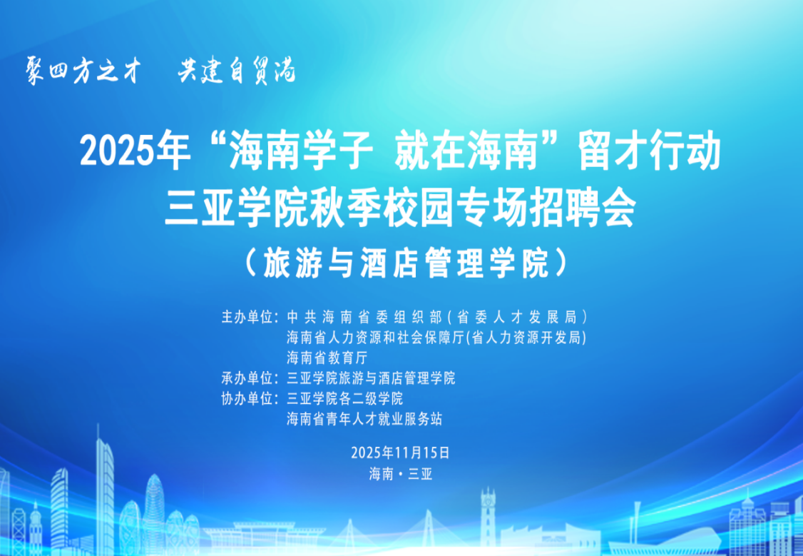 为深入贯彻落实“海南学子 就在海南”留才行动,推动本土高校人才与海南自贸港建设深度融合,2025年11月15日(周六)上午9时,三亚学院旅游与酒店管理学院将携手海南省人力资源和社会保障厅(省人力资源开发局)及多家实力企业,于校内举办秋季校园专场招聘会。本次专场招聘会是三亚学院秋季学期第四场校园招聘会,将为旅游与酒店管理及相关产业领域的学子与优质企业搭建精准对接平台,助力青年人才服务国家经济社会建设发展,扎根海南、共建自贸港。