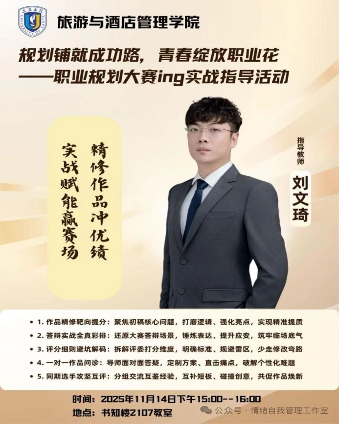 2025年11月14日 ,三亚学院旅游与酒店管理学院于书知楼2107教室,举办职业规划大赛实战指导活动。指导教师刘文琦围绕作品精修靶向提分、答辩实战全真彩排、评分细则避坑解码、一对一作品问诊、同期选手攻坚互评五点,为学生提供全流程指导。