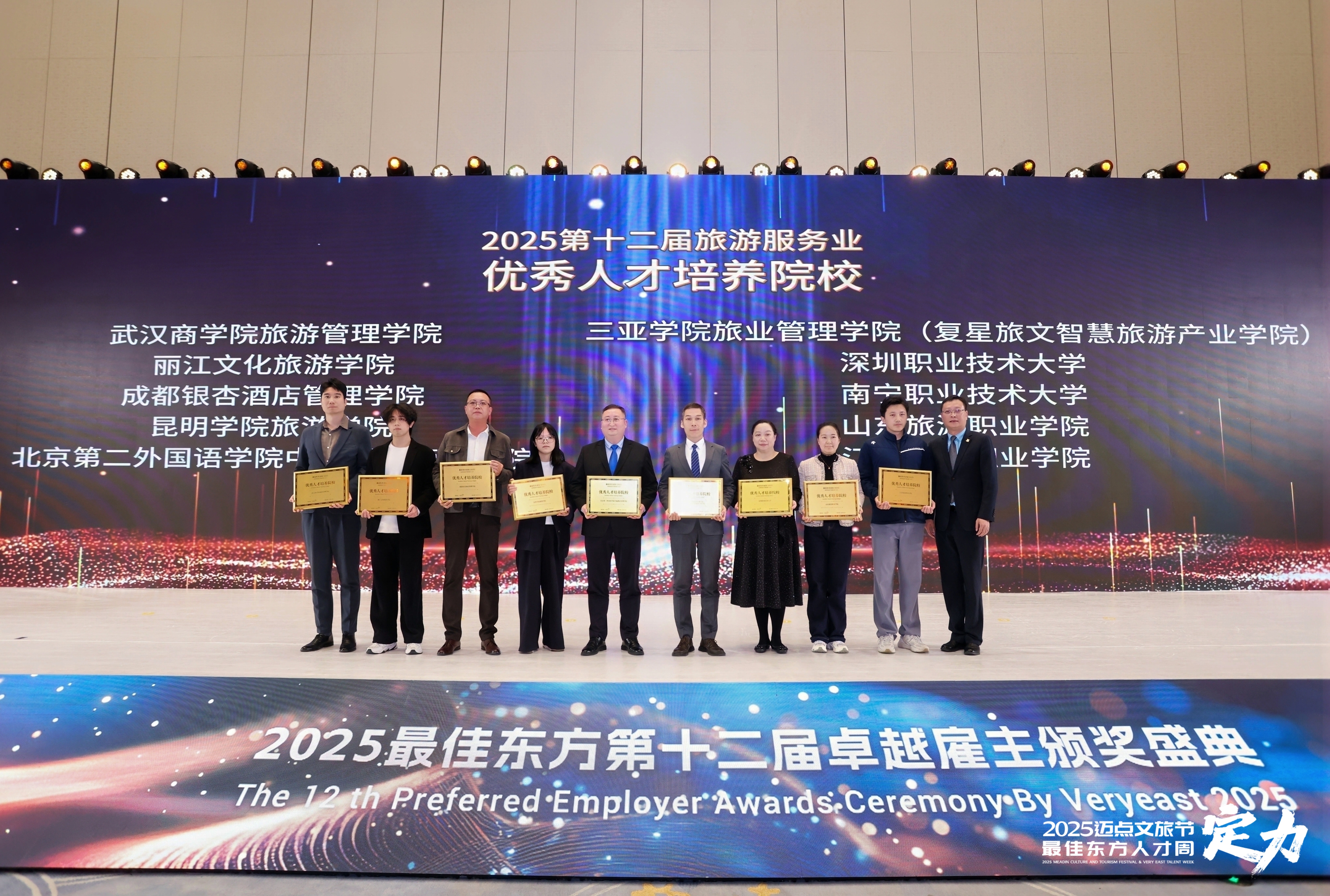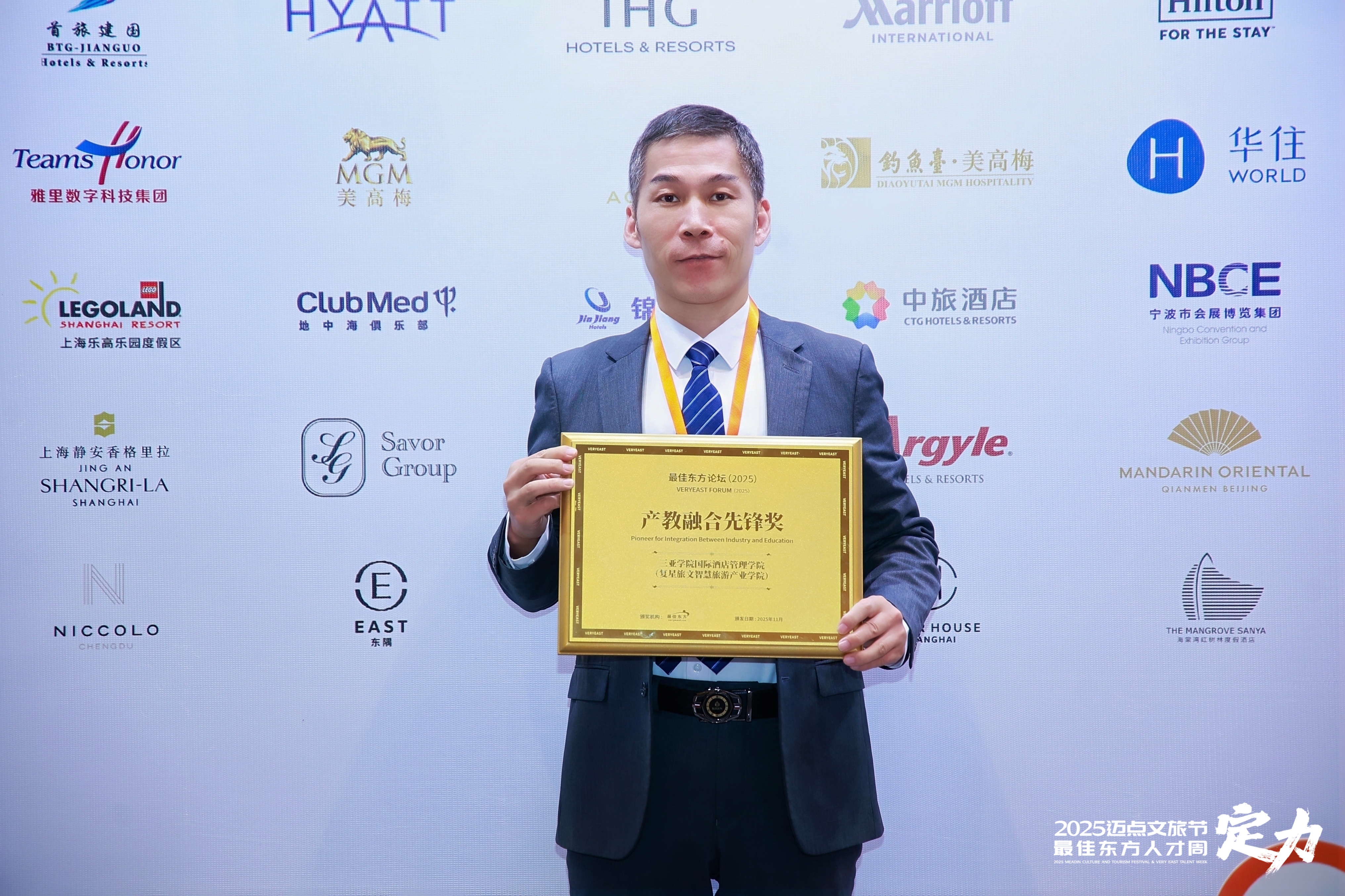 11月20日,由旅游服务业领先平台最佳东方主办的年度教育论坛在杭州隆重举行。国际酒店系主任鲍富元老师代表学院应邀出席本次盛会,并与来自全国各地的教育专家学者、行业领袖及企业精英进行了深入交流。在论坛颁奖典礼上,我院凭借在人才培养模式上的卓越创新与产教融合实践中的突出贡献,一举斩获“优秀人才培养院校”与“产教融合先锋奖”两项殊荣,彰显了学院在对接产业需求、赋能学生成长方面的领先地位。