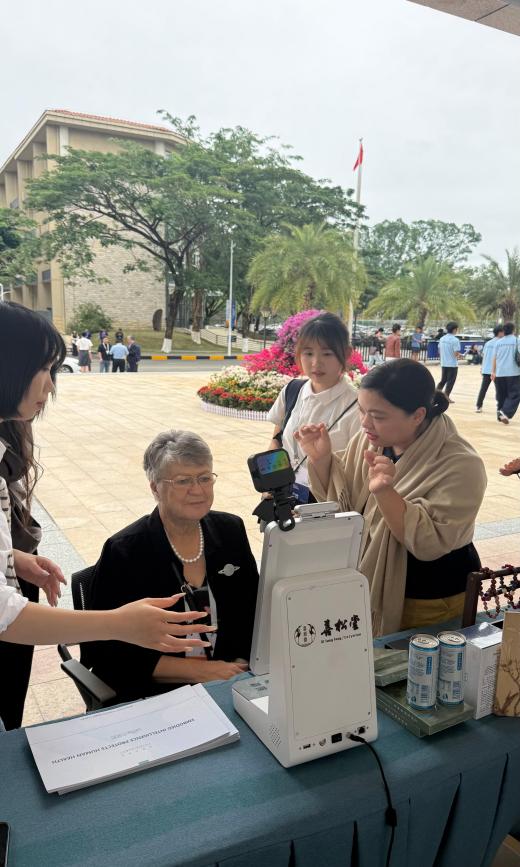 下午会议开始前,项目团队迎来了另一位重要的国际嘉宾——剑桥大学沃尔森学院院长、英国皇家学会院士简·克拉克。克拉克院长亲身体验了“大医匠”的中医诊疗服务,对智能四诊仪的精准诊断和AI艾灸机器人的智能化操作表示赞叹。“这是一个将传统智慧与现代科技完美结合的优秀案例,”克拉克院长在体验后表示,“特别是在康养旅游领域,这种创新具有很大的应用潜力。”