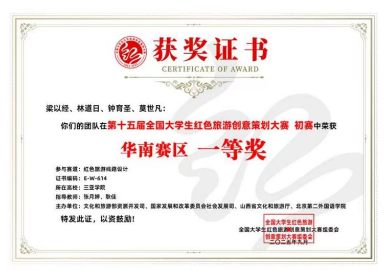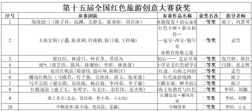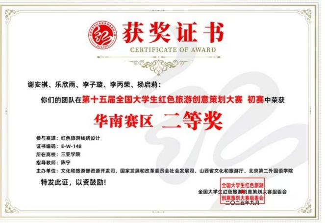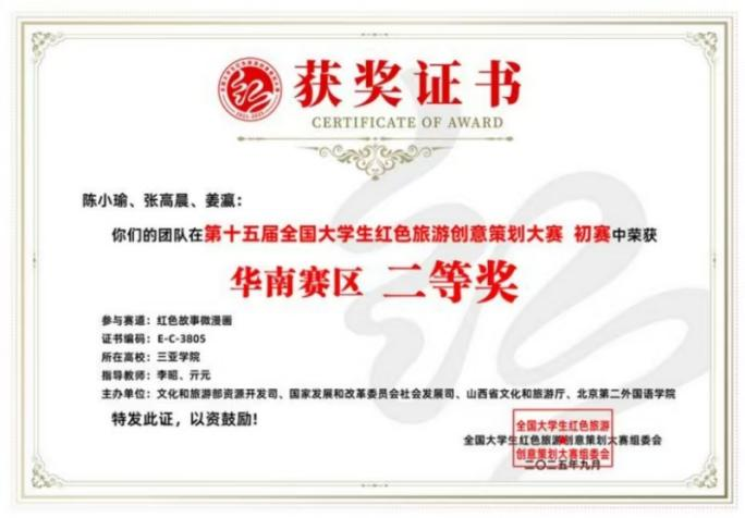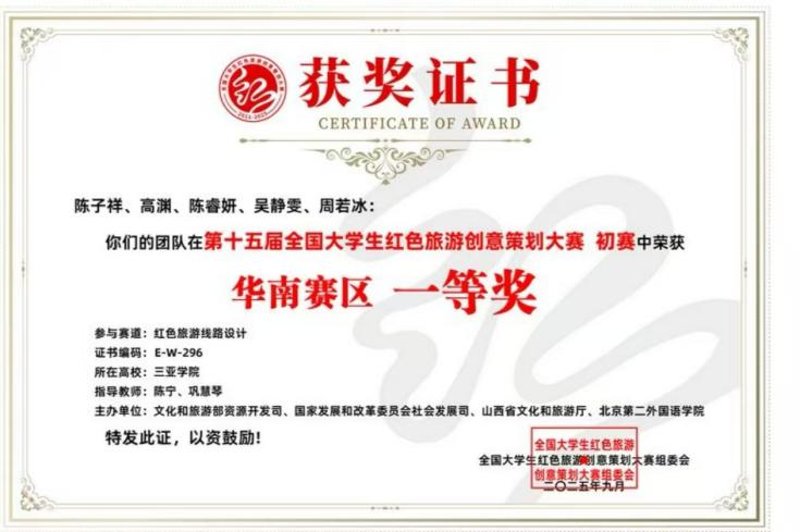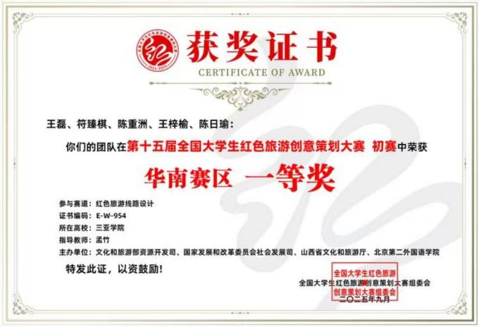 本届大赛以 “用青春创意激活红色基因,讲好抗战故事” 为核心导向,旨在传承伟大抗战精神、推动红色旅游创新发展。我院师生紧扣 “铭记历史、缅怀先烈、珍爱和平、开创未来” 的主题,围绕抗战遗迹、红色文脉等内容展开创意策划:由陈宁、巩慧琴老师指导,陈子祥、高渊等同学组成的 “统统创三” 团队,深度串联抗战历史节点与红色文旅资源,凭借沉浸式体验设计与情感共鸣表达,成功摘得一等奖、由张月婷、耿佳老师指导的作品《初心 —— 北京至郑红色主题策划》以抗战精神为脉络,融合文化体验与研学设计,同样斩获一等奖、由孟竹老师指导的《红色丰碑·薪火相传—延安-西安-铜川革命教育致敬之旅》作品同时也荣获一等奖;同时,陈宁老师指导的 “椰岛红帆行”“写不完组” 团队,孟竹老师指导的 “大展宏图”“琼崖红帆队” 团队,闫静老师、张志辉老师指导的“HC²L”团队以及李昭、刘娜、亓元老师指导的多支队伍,也分别以《红途:山海之间的红色旅游线路》《红醴非遗,醉美宿边》等作品,斩获二等奖。