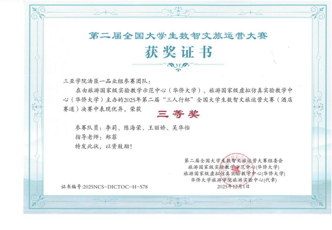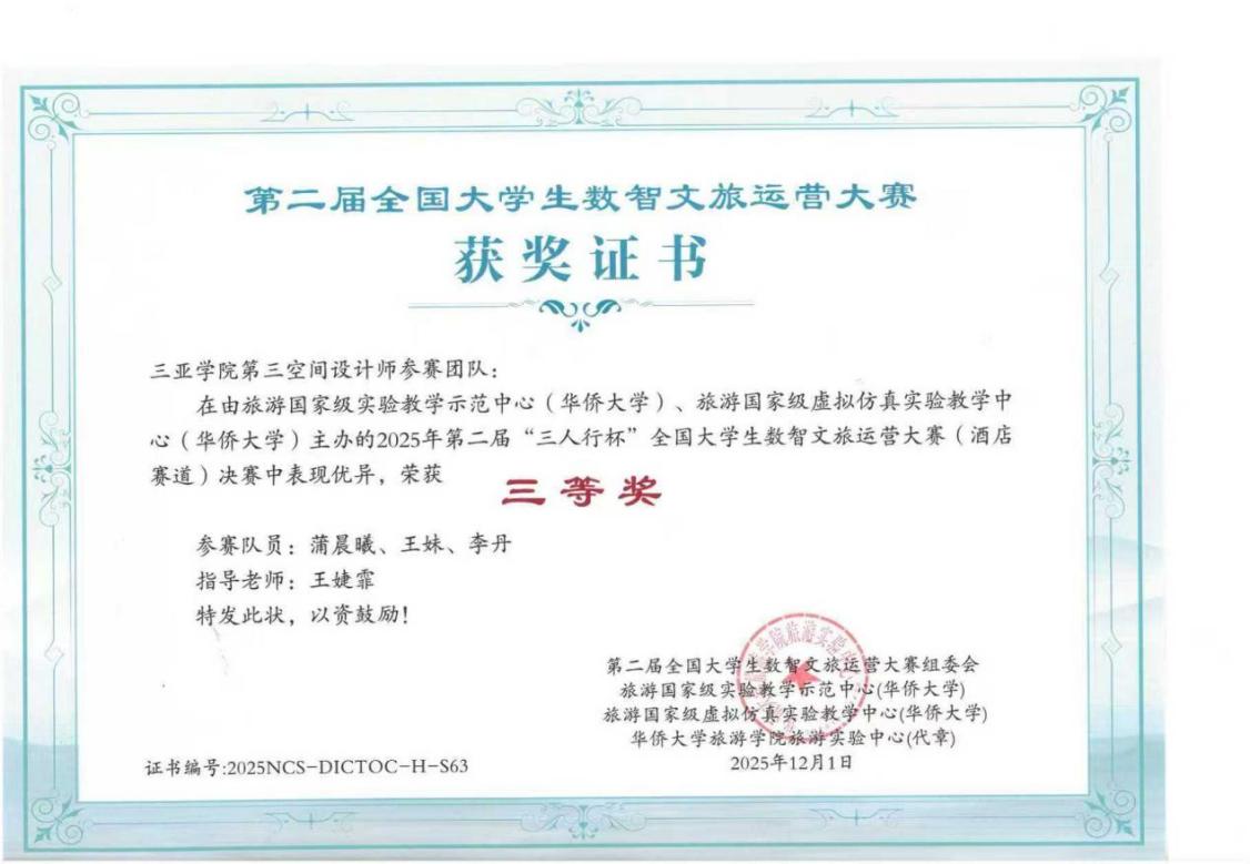 近日,2025年第二届“三人行杯”全国大学生数智文旅运营大赛落下帷幕。我校两支学生团队凭借扎实的专业功底、出色的数智化运营决策能力,在酒店AI数智运营决策赛道中脱颖而出,双双斩获全国三等奖,充分彰显了我校“课赛融通、项目驱动”的教学改革成效,为文旅行业数字化转型人才培养提供了生动实践样本。