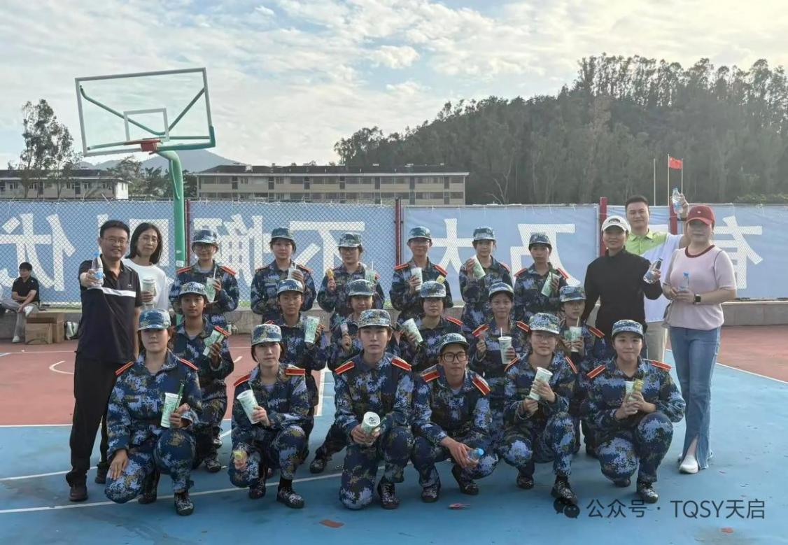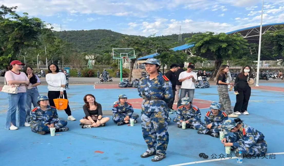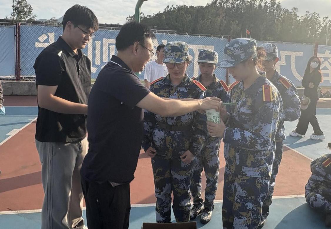 为驱散新生训练疲惫,老师们精心准备奶茶、饮品、零食等慰问品,逐一送到新生手中,清甜饮品与可口零食让训练场满溢温馨。现场还开展趣味素拓游戏与才艺表演环节:问答小游戏里新生踊跃抢答,获胜者收获精美小礼品;失利同学也轮番献上唱歌、跳舞、朗诵等才艺,欢声笑语让紧张的军训氛围变得轻松愉悦。活动最后,师生齐聚拍下大合照,镜头定格下这份师生相伴的温暖瞬间。