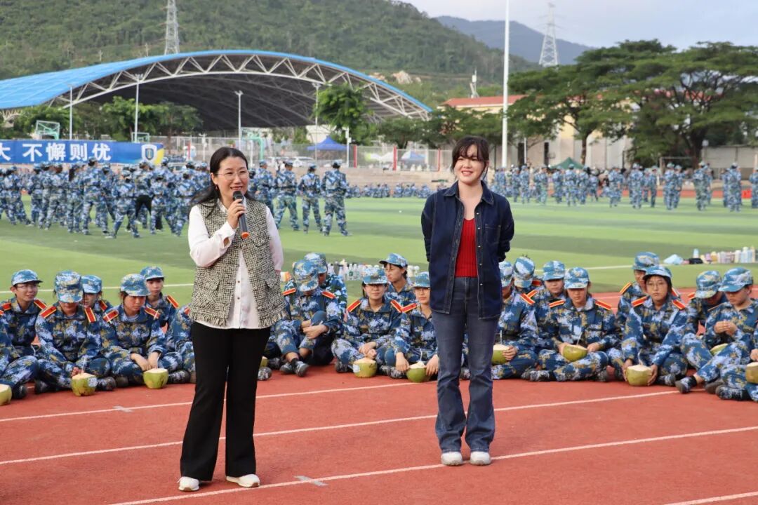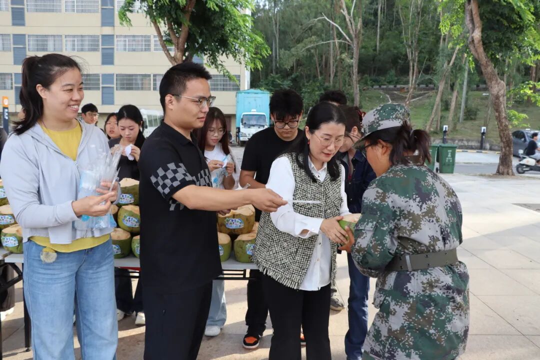 我院院长李慧、党总支书记赵晓乐、团委副书记李琴、思想导师谢浩楠以及学生干部代表带着精心准备的椰子来到训练场,为同学们加油鼓劲。