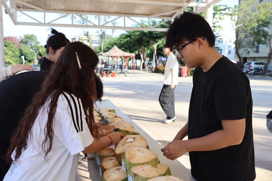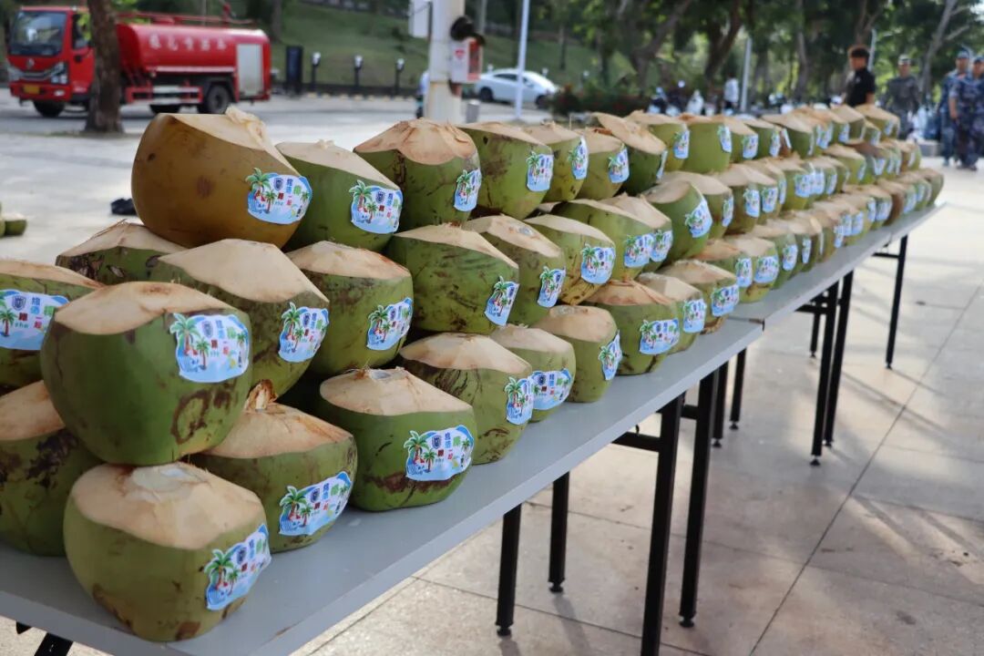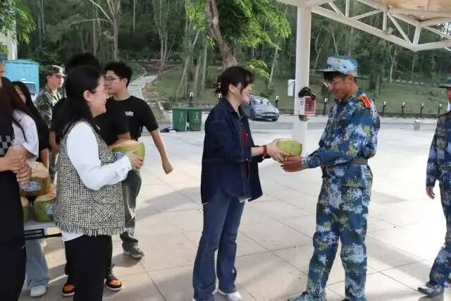 训练间隙,同学们有序领取椰子。当一颗颗青椰送到同学们手中时,训练场上一片欢呼。同学们迫不及待地品尝着清甜的椰汁,脸上洋溢着幸福的笑容。