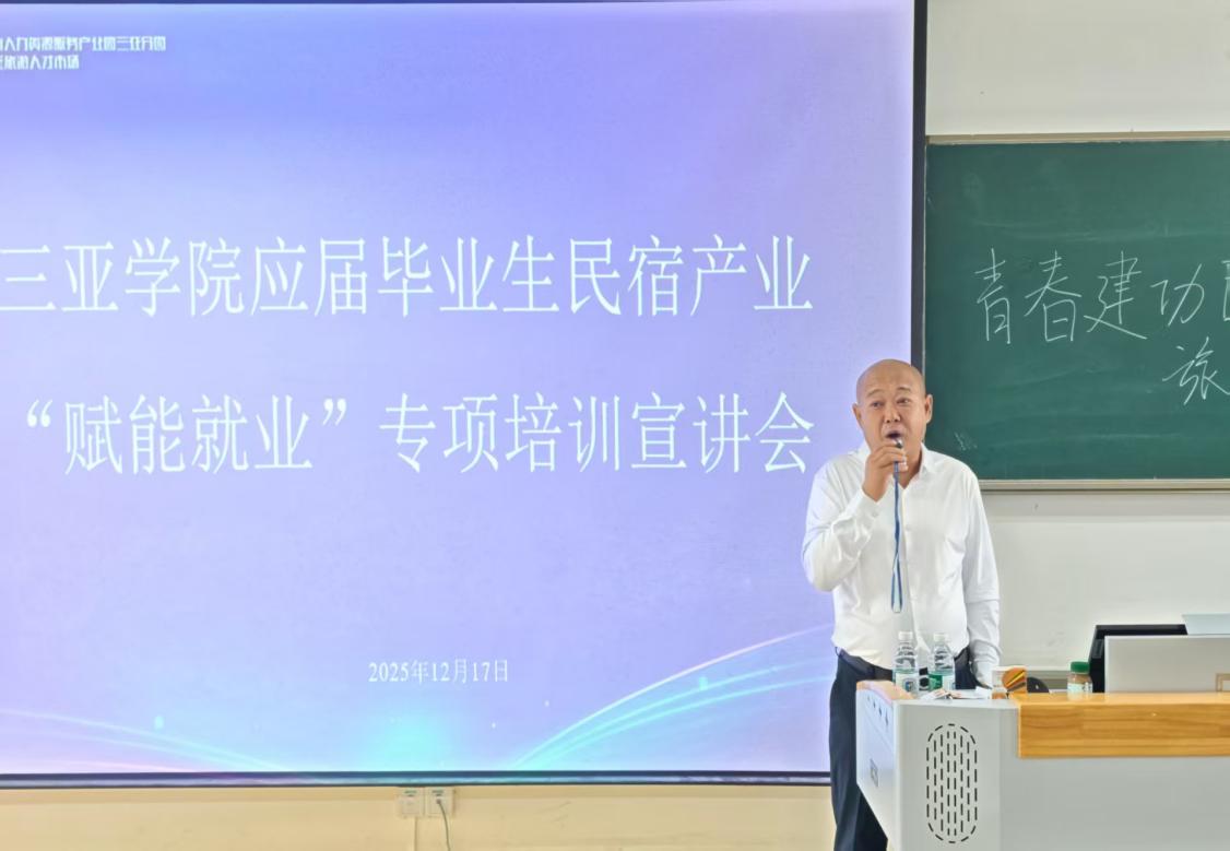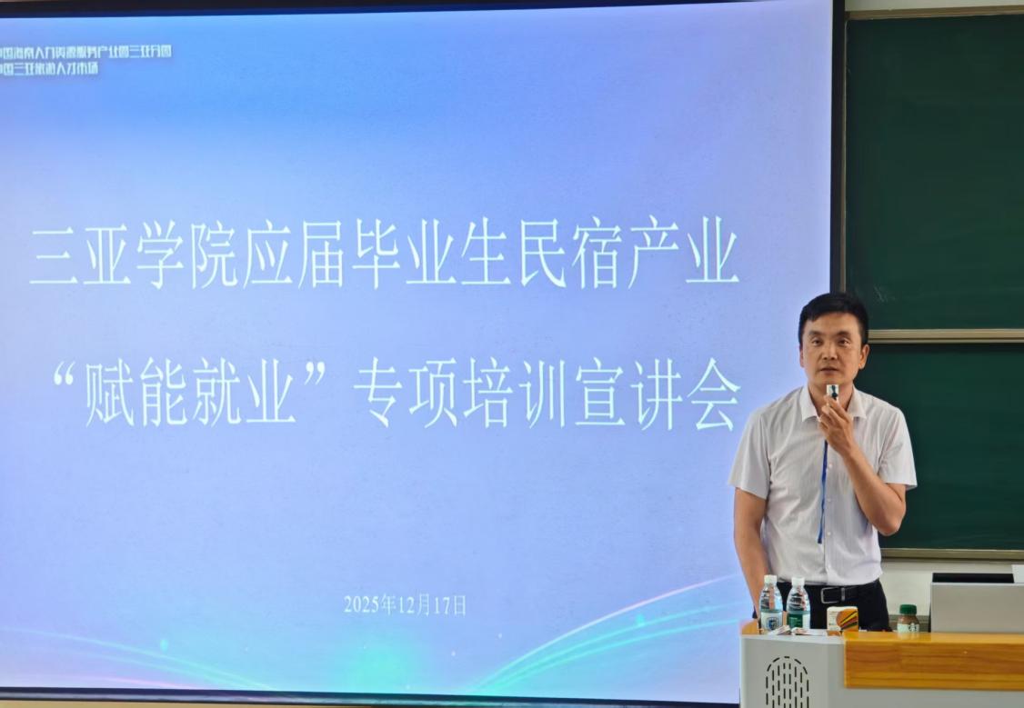 2025年12月17日下午,中国三亚旅游人才市场民宿旅游人才专项培训高校宣讲会在三亚学院书新五号楼顺利召开。作为衔接高校人才与民宿产业的重要桥梁,本次宣讲会由中国海南人力资源服务产业园三亚分园、中国三亚旅游人才市场联合主办,三亚市人力资源和社会保障局全程指导,紧扣自贸港建设战略部署,精准锚定民宿产业人才短板与高校毕业生就业痛点,为青年学子量身打造“技能提升-认证上岗-留琼发展”全链条成长通道,助力青春力量扎根海南、赋能产业。
