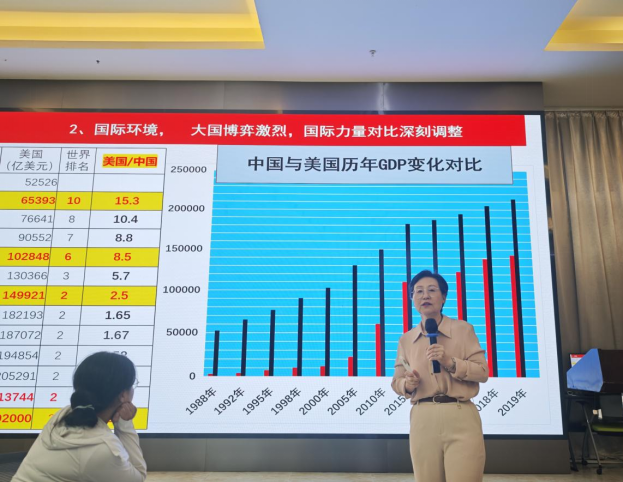 专业的数据分析是同学们应该掌握的专业技能。杨教授利用几组数据,通过柱状图、折线图等展示并向同学们讲解了各国经济增长特别是中美经济对比国际力量的变化情况,经过改革开放40多年的发展,我国与美国的综合国力差距在迅速缩小,百年变局一方面体现在我国所处的经济发展阶段以及我国在大国博弈中所处的历史方位发生变化,也体现科技革命形成的发展不确定性,还体现在美西方不甘心这种变化并采取逆全球化的手段导致的世界纷争及局部战争。