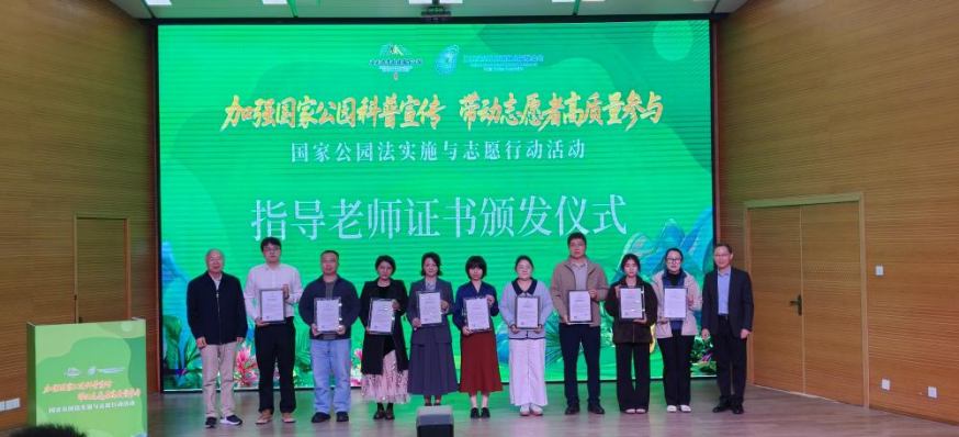 中国工程院郝吉明院士亲自为国家公园科普工作中的优秀指导教师代表颁发证书,以表彰他们在高校科普志愿队伍培育、青少年生态教育指导等方面的突出贡献。