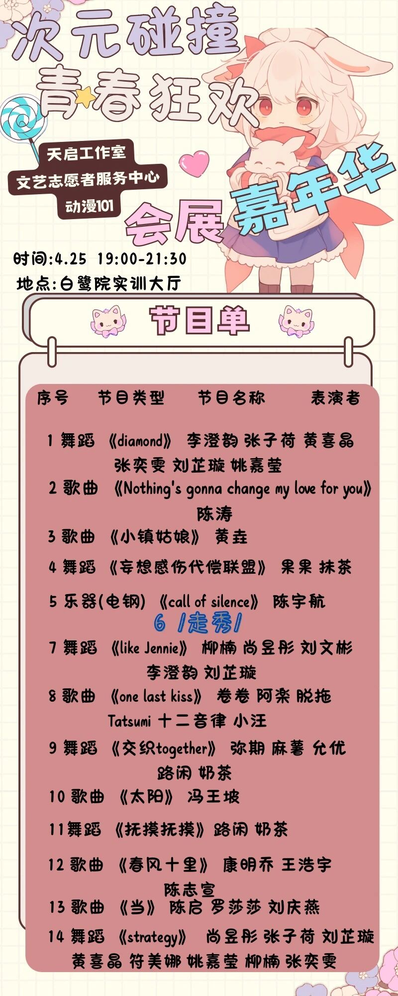 在此,我们诚挚地邀请您参加本届会展嘉年华!这场活动不仅是青春的狂欢,更是会展专业魅力的展示。别再犹豫,快来参与“次元碰撞 青春狂欢”,释放青春活力,留下一段难忘的美好回忆吧!本周五晚我们不见不散!!