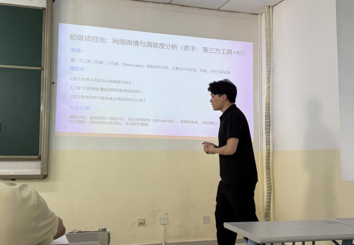 辛铭涛老师创新构建“师-生-AI”三元协同教学新生态,以三亚本土文旅企业真实管理问题为贯穿性项目,将计划、组织、领导、控制等核心职能嵌入实践场景。教学中深度融合AI工具,引导学生运用智能技术进行数据洞察、方案模拟与决策优化,通过多元智能化评价与产业零距离对接,实现“从知道到做到”的能力转化,着力培养兼具管理智慧、数字化能力与伦理意识的未来文旅行业引领者。