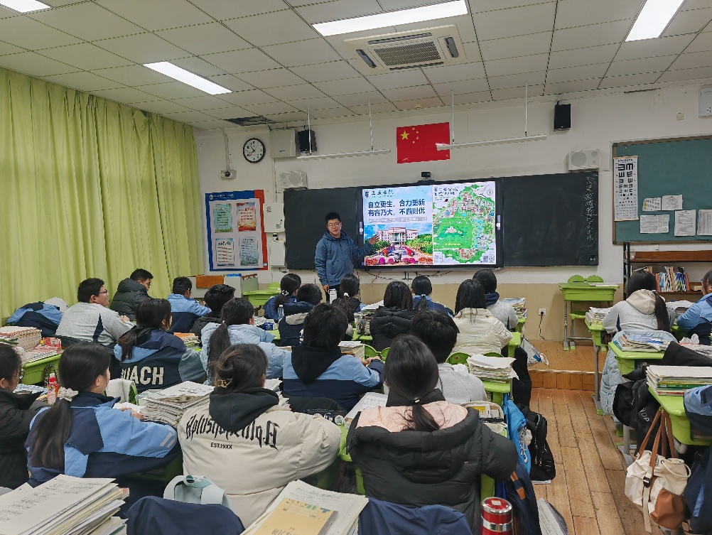 2月2日,旅酒学院智慧旅游专业2501班的谭啸怀揣着对高中母校的怀念,从椰风海韵的海南三亚回到了书香浸润的山东省青岛二中分校。作为“把我的大学带回家”寒假社会实践的参与者,为高一三班与高一四班的学弟学妹们带来了一场饱含温度的大学生活分享,以学长的身份传递成长力量。