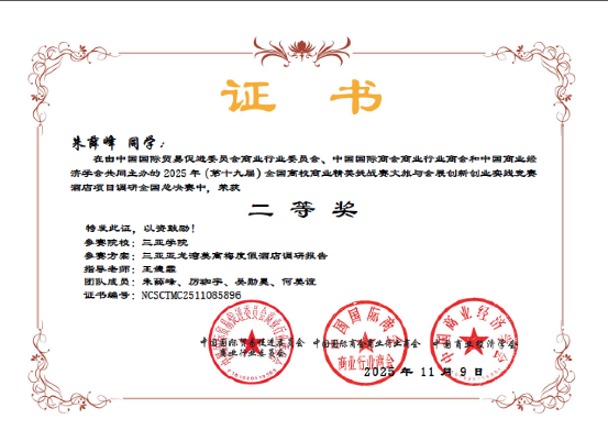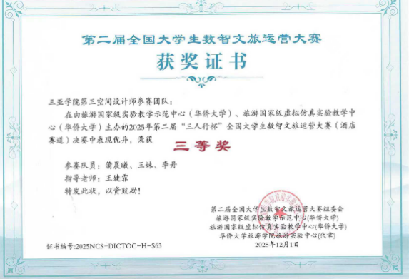 目前,《旅游目的地管理》课程已逐步构建起“课堂项目—科研训练—竞赛实践”的递进式培养路径,显著提升课堂质效和学生的创新实践能力。酒店专业学生在非遗资源开发、生态旅游设计等方向形成了一批具有实践价值的成果——如在2023年“旅投杯”全国大学生海南自贸港旅游产品创新大赛荣获华南赛区一等奖;2023–2025年多项省级大学生创新创业项目(包括《文旅融合背景下海南热带雨林“露营+”模式发展的可行性研究》《文旅融合背景下海南非遗“椰雕”商化发展研究》《乡村振兴背景下海南环岛旅游公路旅游价值开发影响研究》)顺利立项/结项;并在全国商业精英挑战赛及全国大学生数智文旅运营大赛中斩获多项一、二、三等奖。这些成果充分体现了AI赋能项目制教学在提升教学质量、强化产学研融合与促进学生就业竞争力方面的实际成效。