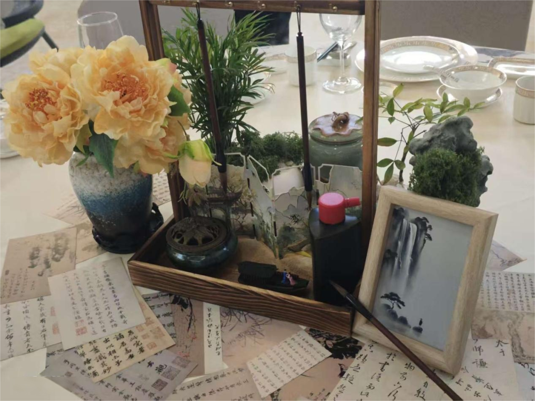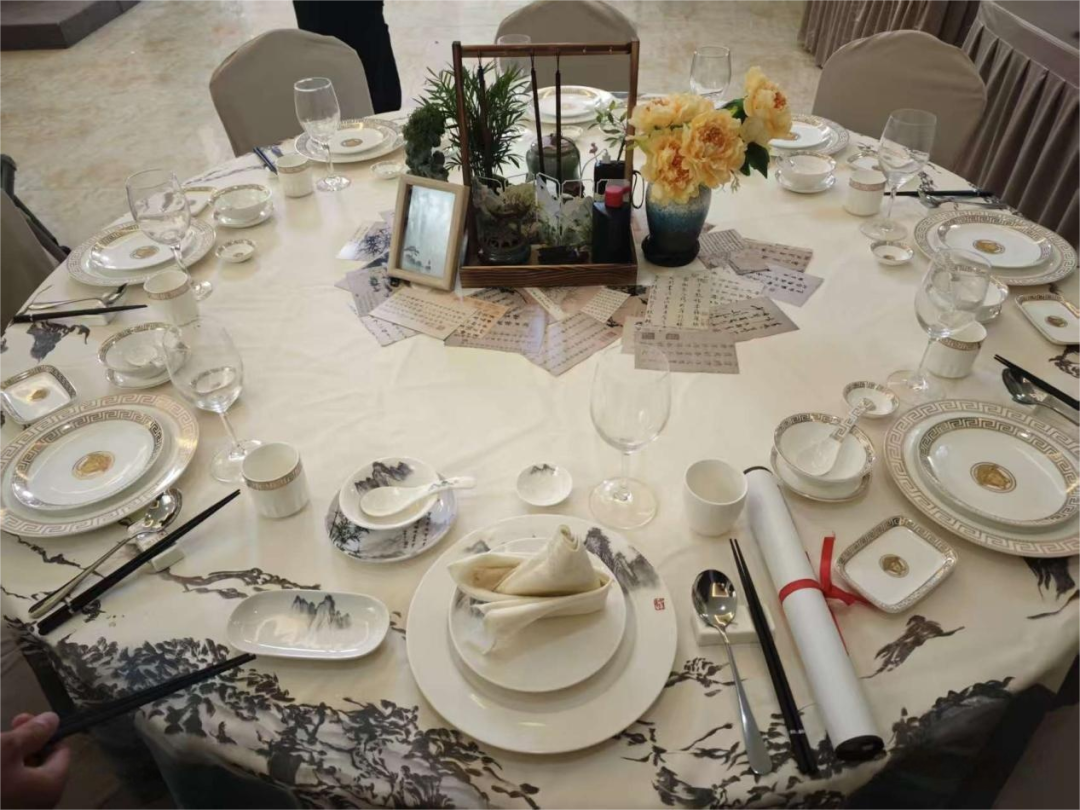桌布选用水墨山水纹样,与餐具边缘的古典纹样呼应,奠定雅致基调;中心装饰以木质框架为载体,嵌入微型山水造景、毛笔摆件与墨瓶,搭配暖黄色牡丹花艺,兼具文气与暖意;席间散落的书法笺纸、小巧的山水相框,让每一处细节都浸透着中式美学的含蓄与精致。餐具摆放规整有序,餐巾折叠简洁利落,既符合宴会礼仪规范,又与整体国风氛围浑然一体。