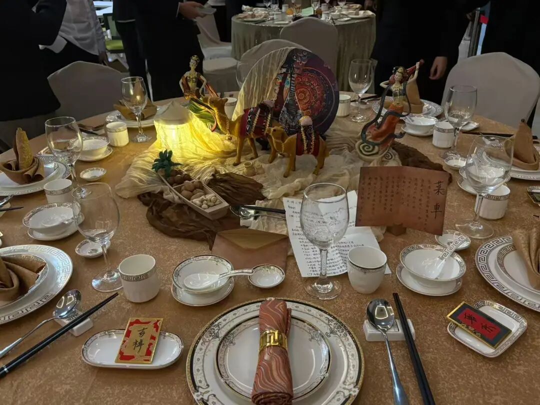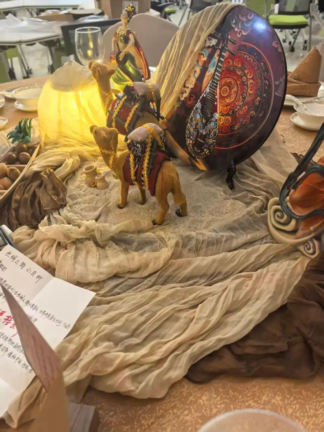第3名 “丝绸之路”主题宴会设计作品。以“丝绸之路”为主题,呈现中西合并的文化碰撞,因此宴会设计作品呈现异域文化氛围和基调。作品以丝绸古道为灵感,台面铺设香槟金色提花绸缎,仿若大漠沙丘。中心景观以琉璃打造微型“驼队”,蜿蜒于香料与干果点缀的“商路”之上。青瓷与鎏银餐具交错陈列,喻示东西方文明对话。整体设计将历史意象融入现代宴会美学,再现丝路沿线交融共生的文化盛景。