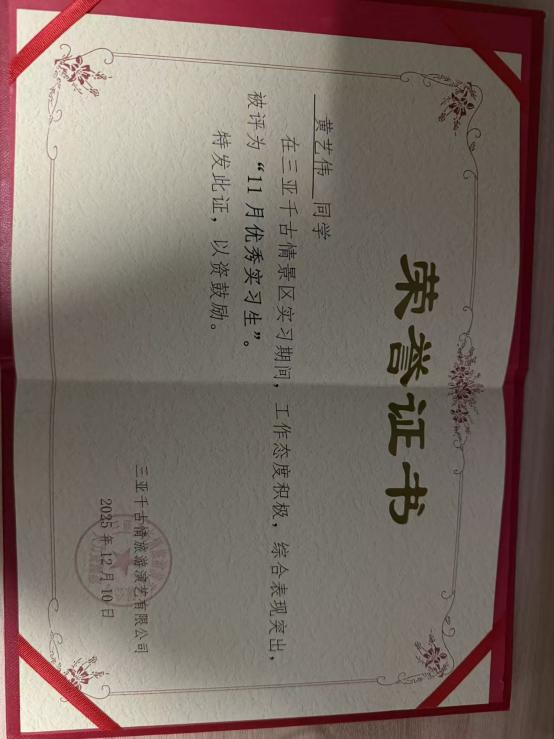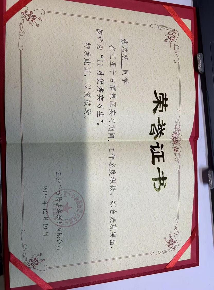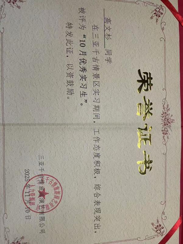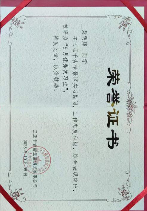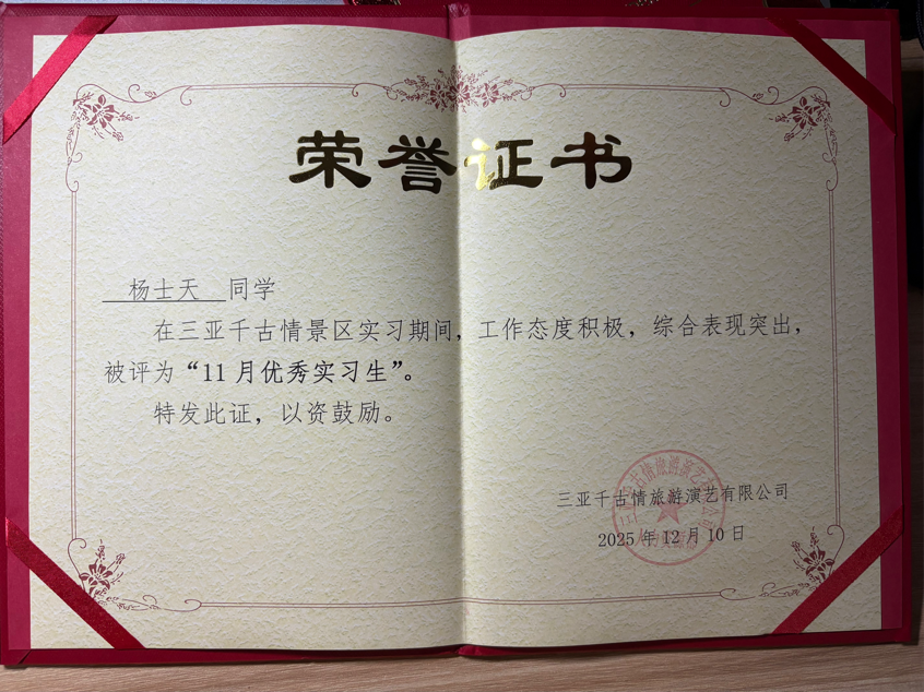 在充满挑战的游乐工程部,同学们更是展现了独特的跨界应用能力。黄艺伟同学的工作横跨戏水区、科技馆、恐怖研究院等多个技术型场地,他不仅保障安全运营,更参与设备维护、宣传视频剪辑,其经历本身就是对“旅游+科技”融合的生动诠释;陈绫同学通过系统培训与轮岗,深刻认识到“每个岗位都有其特殊性”,并在服务国际游客中主动应用外语,体现了智慧旅游时代对复合型人才的要求;刘铭昊在设施安全检查、客流疏导中,展现出对运营安全这一智慧景区管理核心议题的深刻理解;在剧场实习的杨士天同学意识到从熟悉座位分布、引导观众有序入场,到维持观演秩序、耐心解答疑问,每一个环节都关乎观众的体验与演出的顺利进行,深刻体会到服务工作的细致与重要,学会了主动沟通、沉着应对突发情况,也懂得了礼仪规范与责任担当,并且连续获得了两次优秀实习生的荣誉。