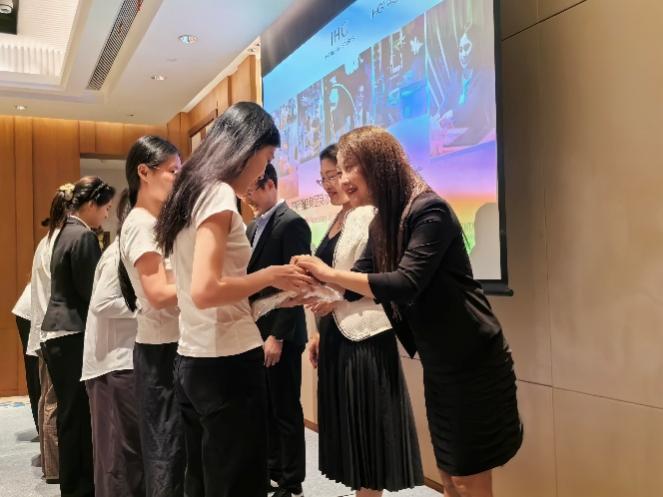 为开启学员职业身份的转变与学习旅程,活动特别设置授徽环节。在激昂的背景音乐中,首届“洲际英才班”学员依次上台,校企双方领导共同为每位同学佩戴“IHG ACADEMY”专属徽章,并发放定制T恤与纪念礼品。一枚枚徽章,不仅是身份的象征,更是对学员们未来职业发展的美好期许。