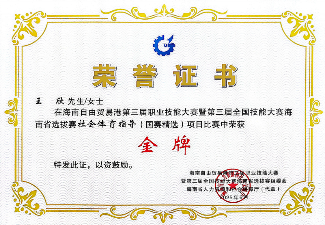 近日,海南省人力资源和社会保障厅、海南省教育厅印发《关于授予2024—2025年度职业技能竞赛优秀选手“海南省技术能手”称号的通知》,对在相关职业技能竞赛中取得优异成绩的选手授予“海南省技术能手”称号。继此前在第三届海南自贸港技能大赛中获社会体育指导(健身)项目省级金牌并受到表彰后,三亚学院教师王欣荣获“海南省技术能手”称号。此次获奖不仅是对其专业能力、实践水平和职业素养的充分肯定,也展现了教师在学校结构性改革和项目制教学推进中的示范引领作用。