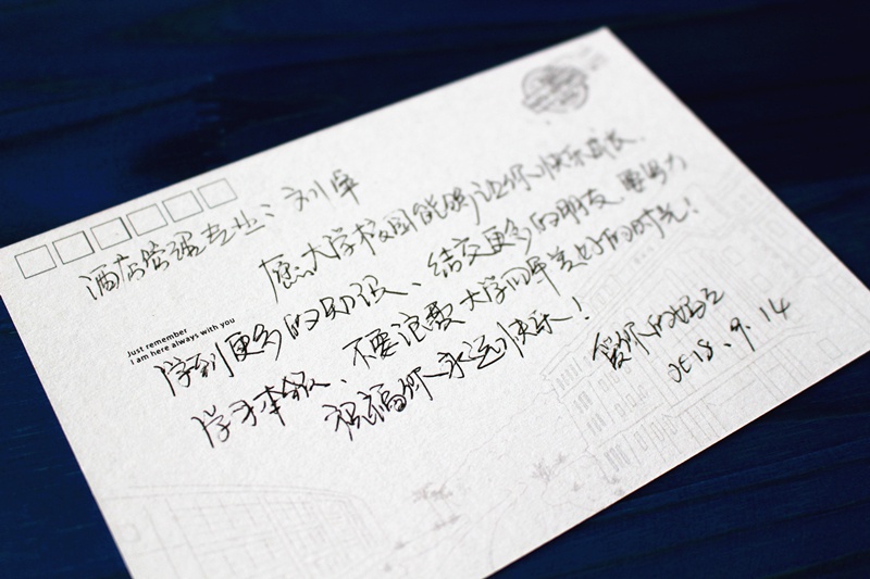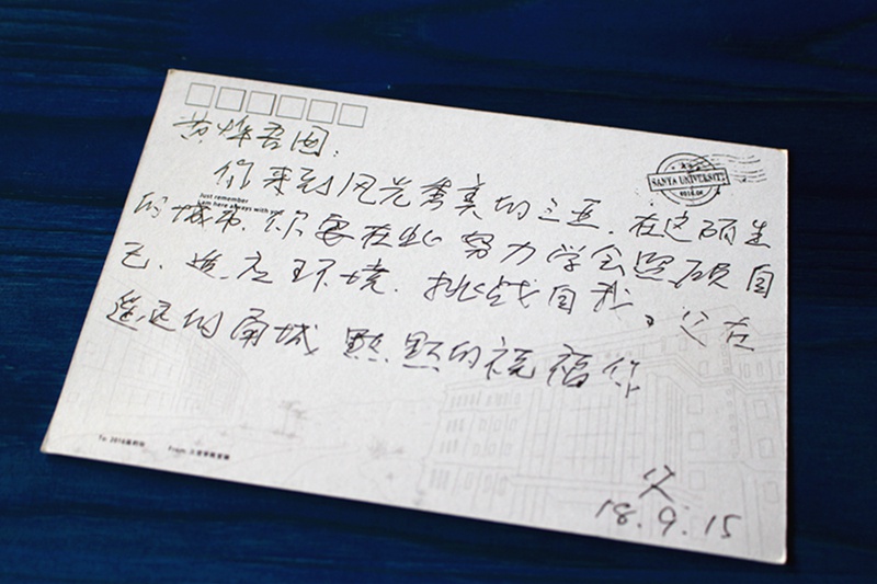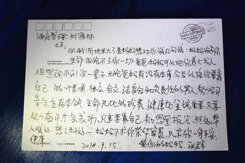 18级迎新时间为期三天,我院共有五十九位新生家长,在会场休息区写下这封特殊的明信片。不求你乘风破浪,排除万难,只求你少经风浪,万事平安。请你记得,记得临行前爸妈给你的百般叮咛,记得家中盼你归来的身影。期待下一次的重逢吧,那时的你一定比现在豁达,稳重。