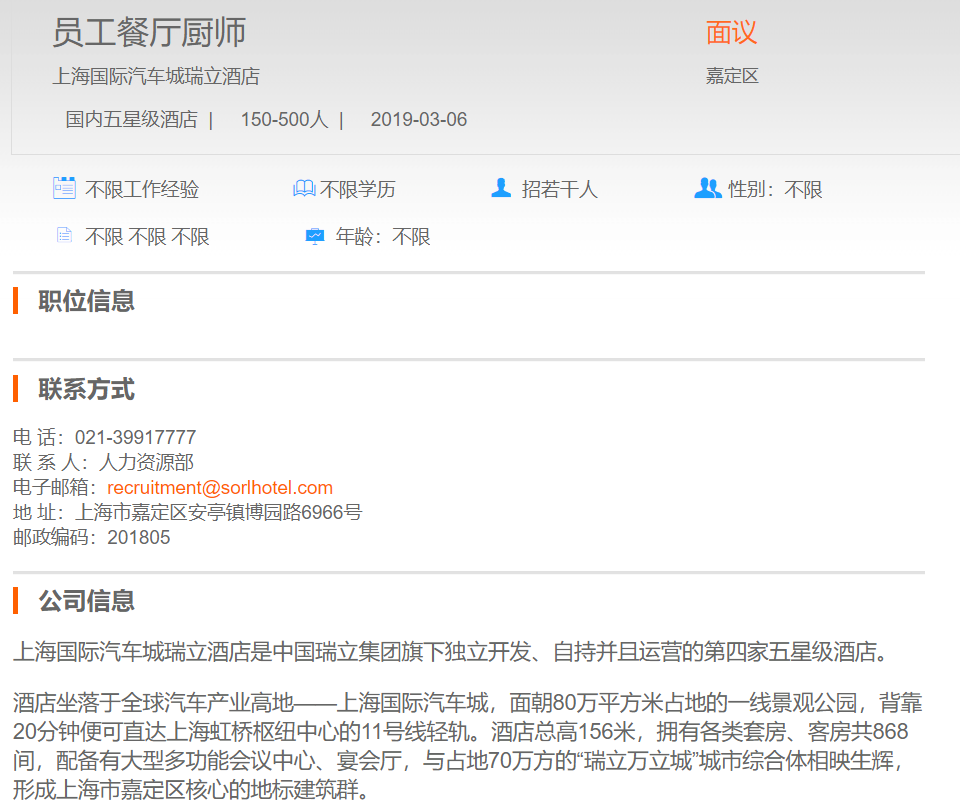 上海国际汽车城瑞立酒店员工餐厅厨师
