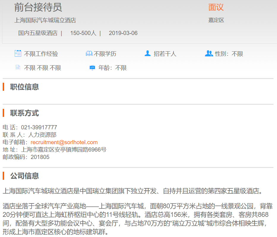 上海国际汽车城瑞立酒店前台接待员