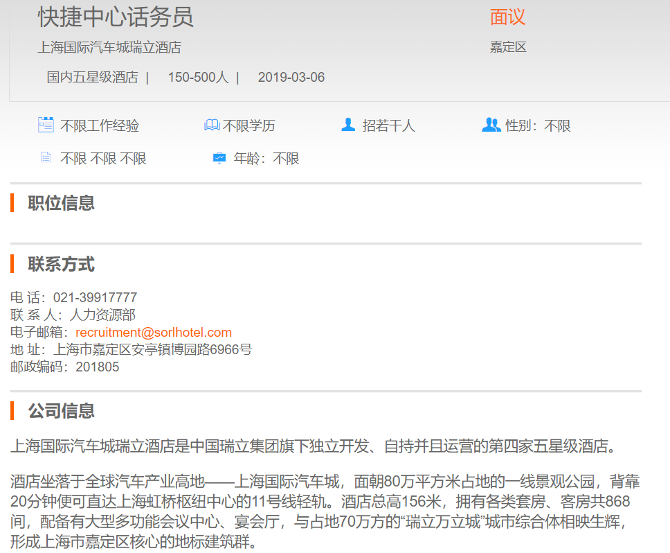 上海国际汽车城瑞立酒店快捷中心话务员