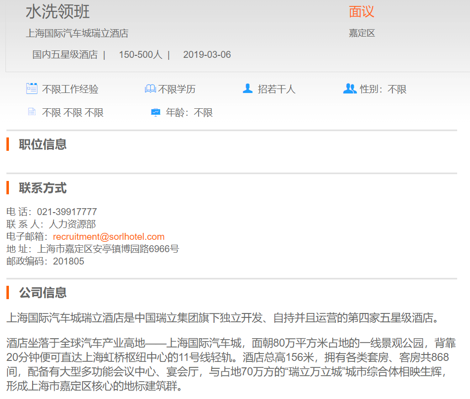 上海国际汽车城瑞立酒店水洗领班