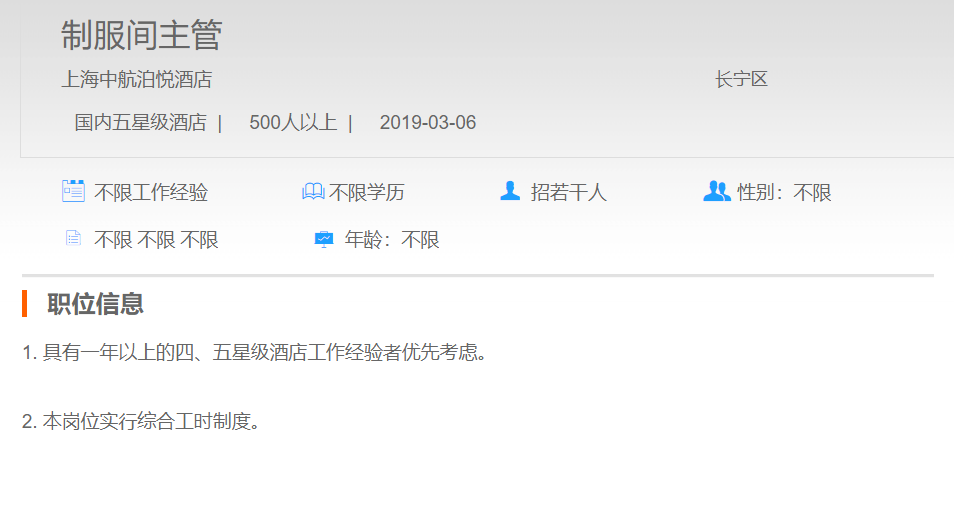 上海中航泊悦酒店制服间主管