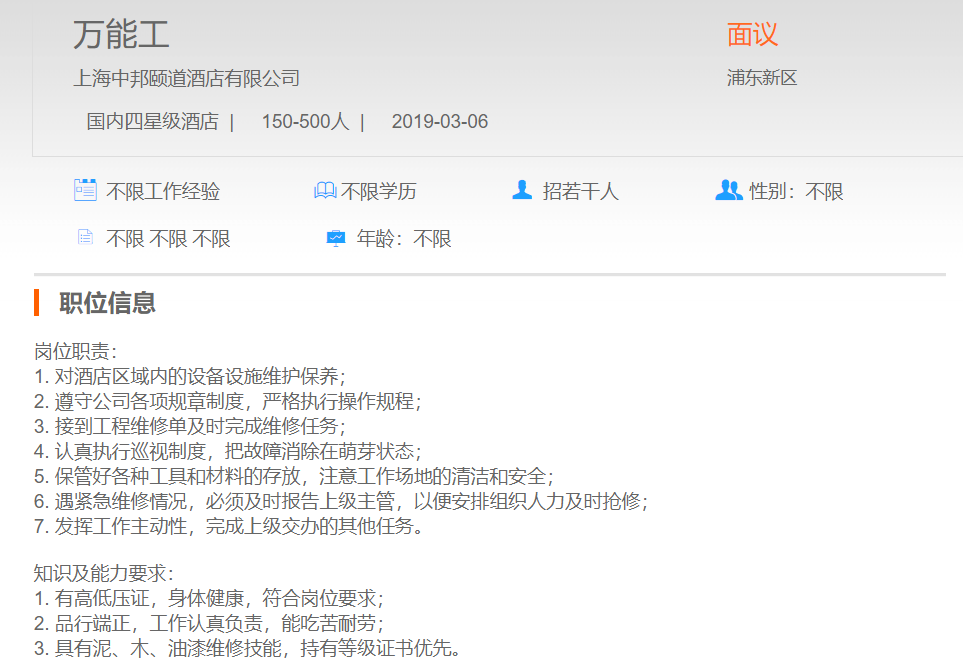 上海中邦颐道酒店有限公司万能工