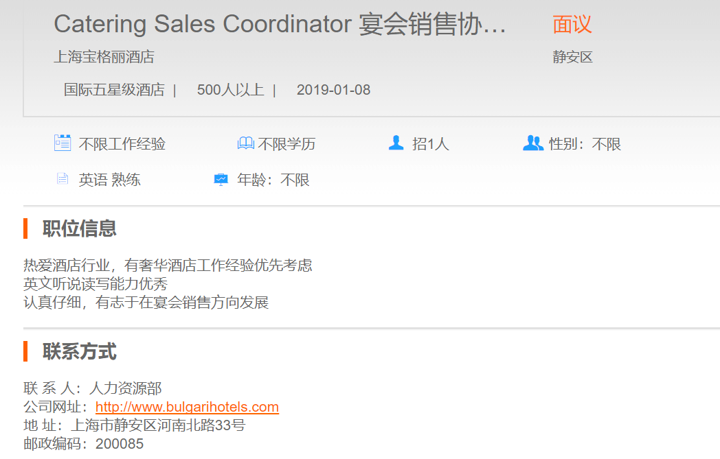 上海宝格丽酒店宴会销售协调员