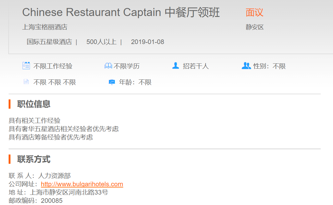 上海宝格丽酒店中餐厅领班
