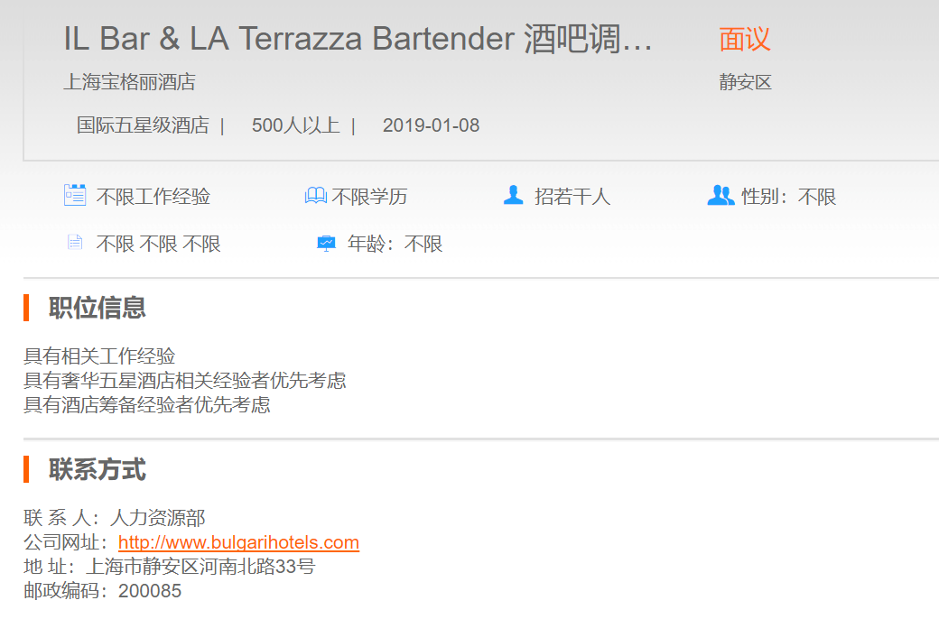 上海宝格丽酒店酒吧调酒师