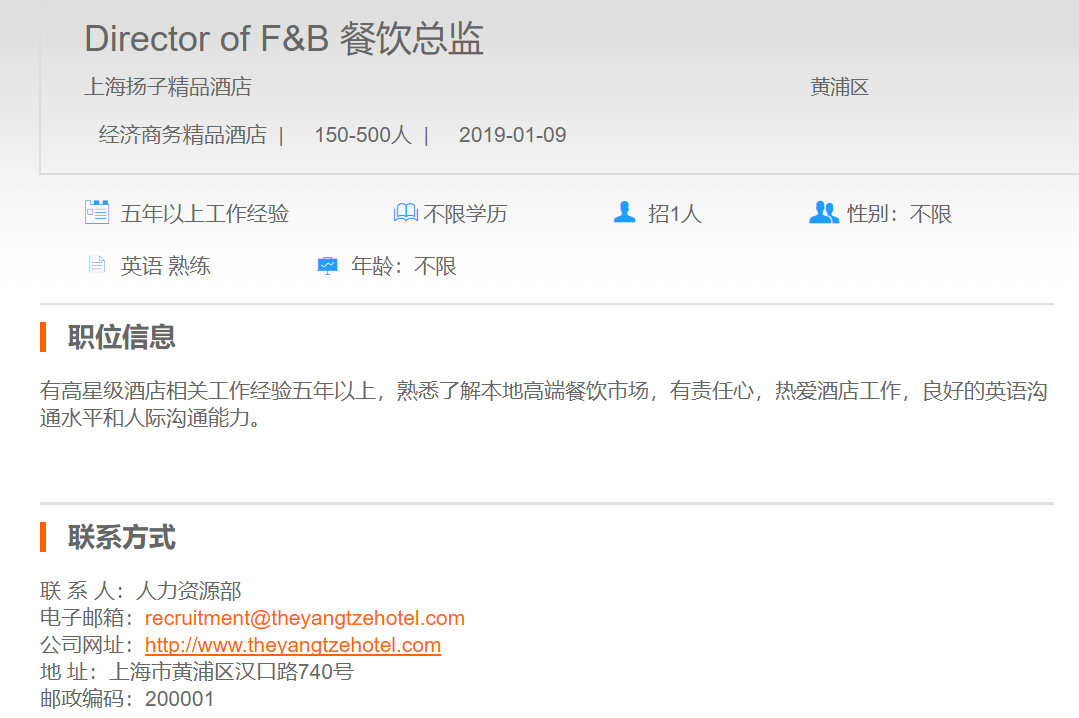 上海扬子精品酒店餐饮总监
