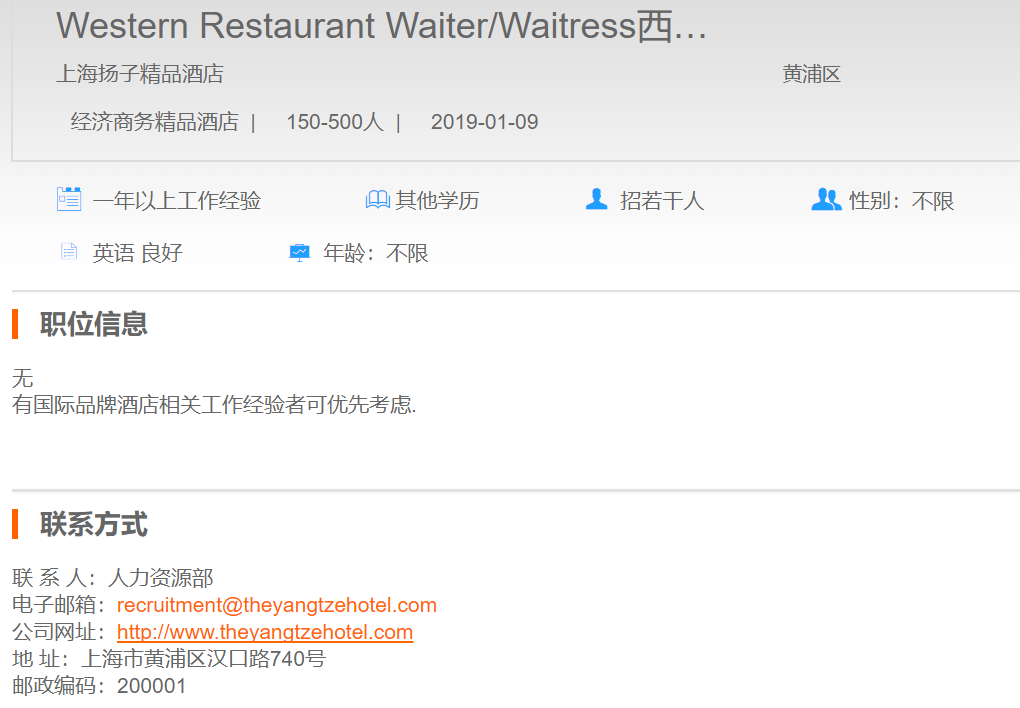 上海扬子精品酒店西餐厅服务员