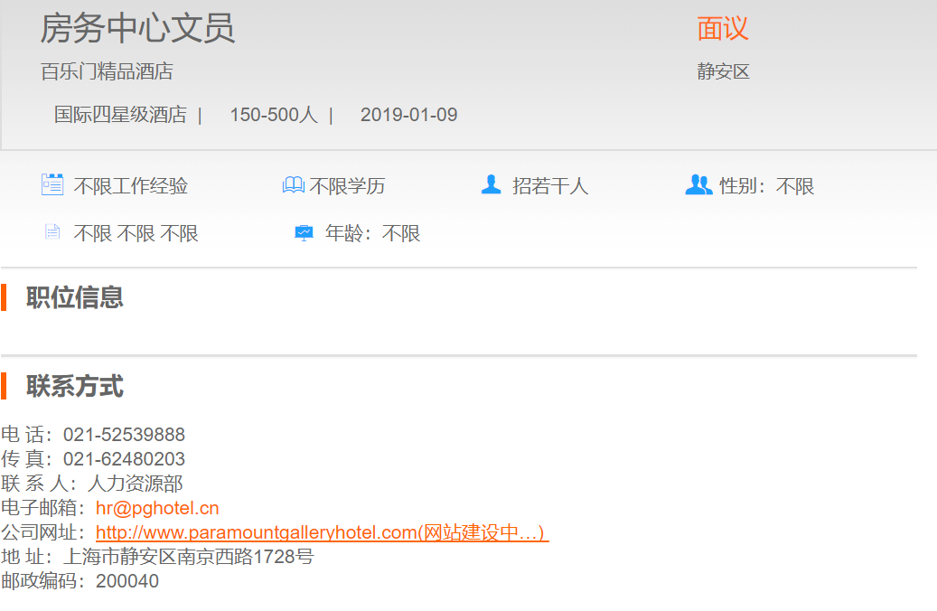 百乐门精品酒店房务中心文员