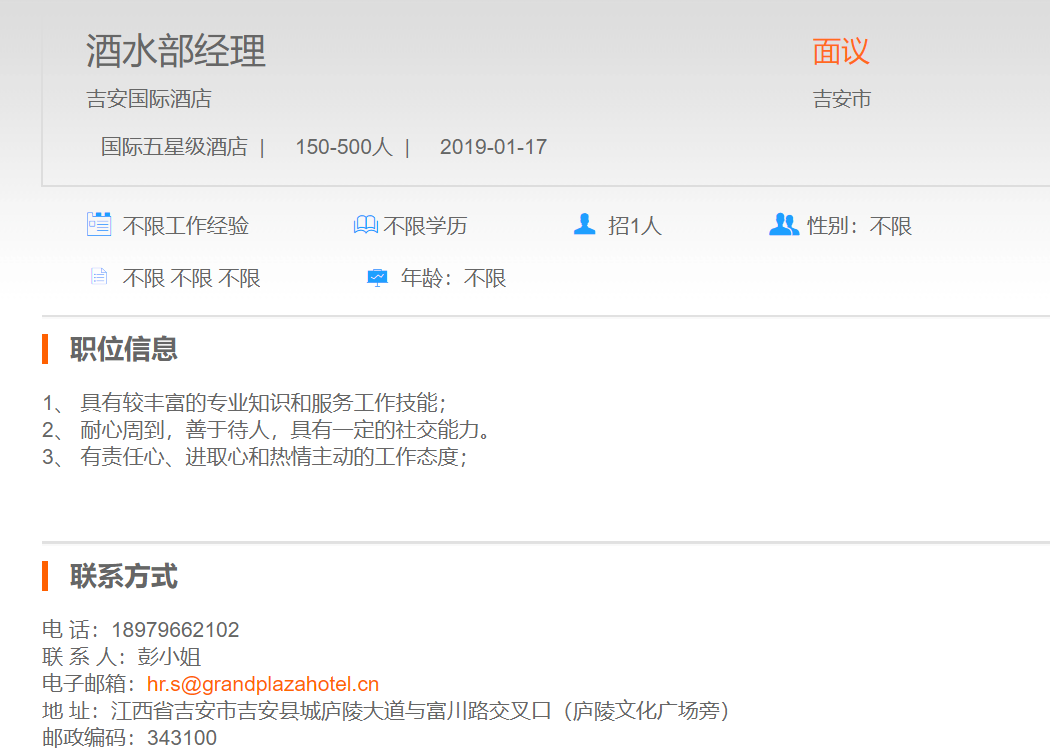 吉安国际酒店酒水部经理