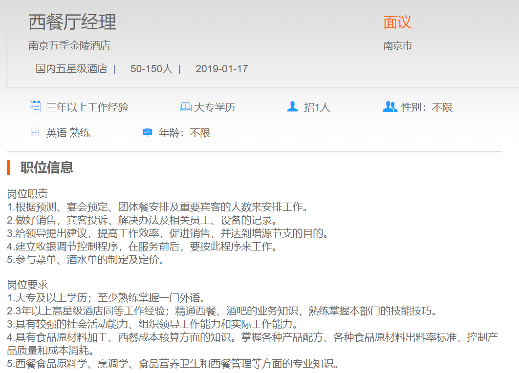 南京五季金陵酒店西餐厅经理