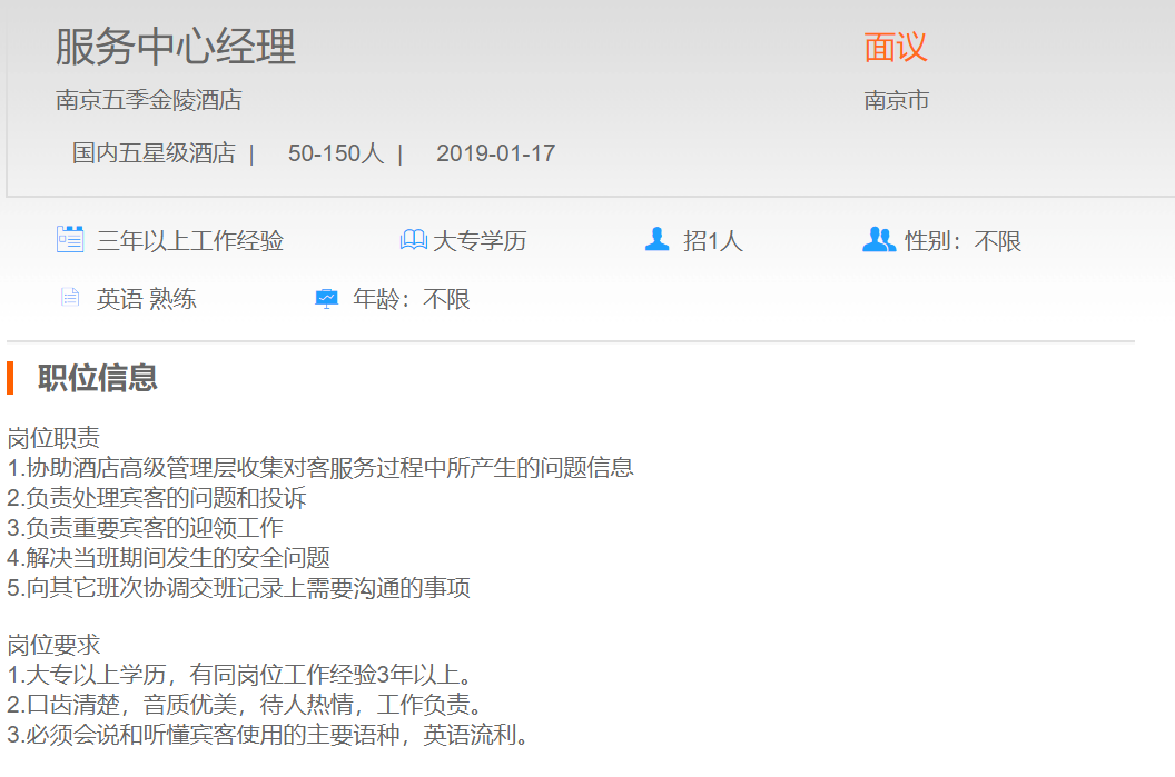 南京五季金陵酒店服务中心经理