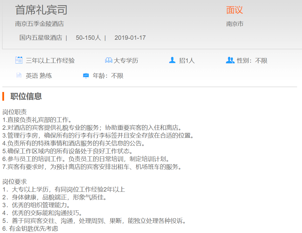 南京五季金陵酒店首席礼宾司