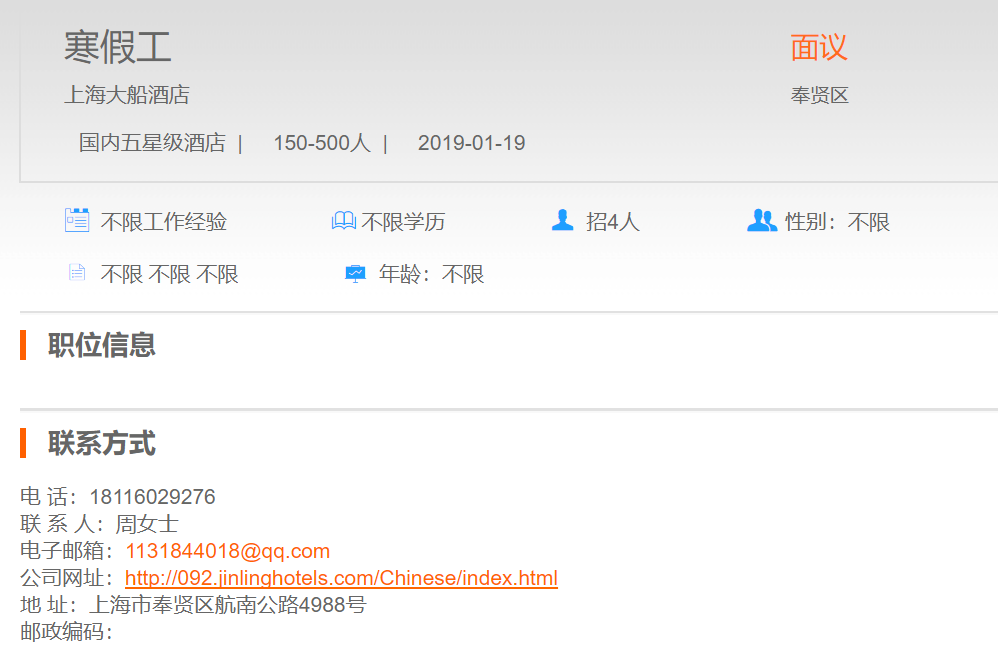 上海大船酒店寒假工