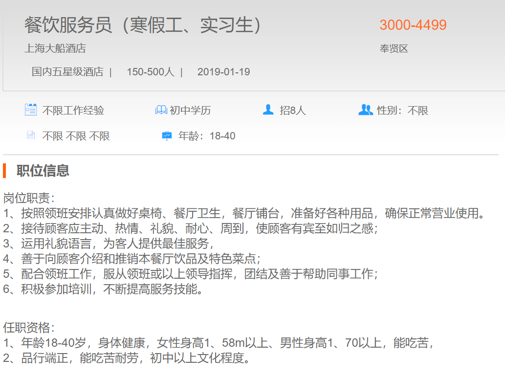 上海大船酒店餐饮服务员