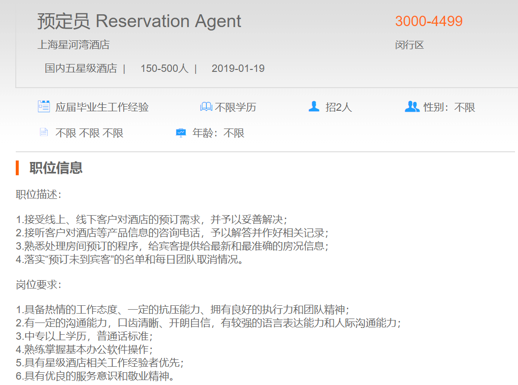 上海星河湾酒店预订员