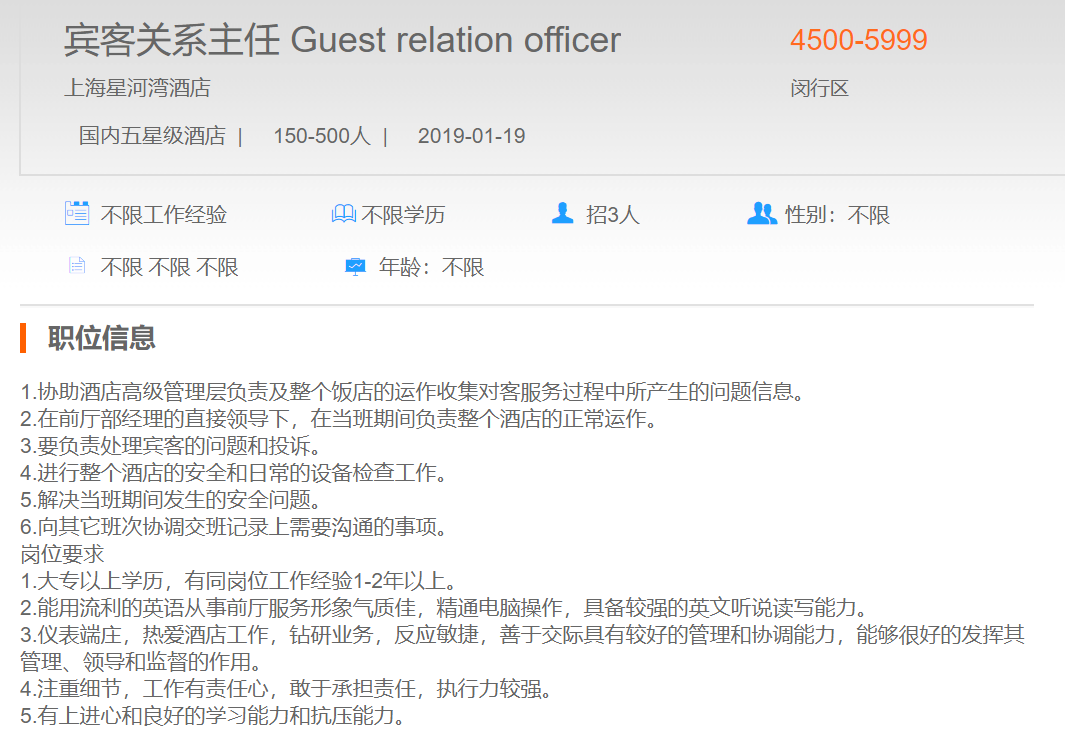 上海星河湾酒店宾客关系主任