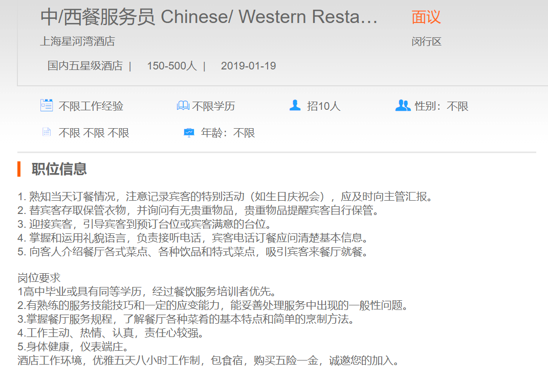 上海星河湾酒店中|西餐服务员