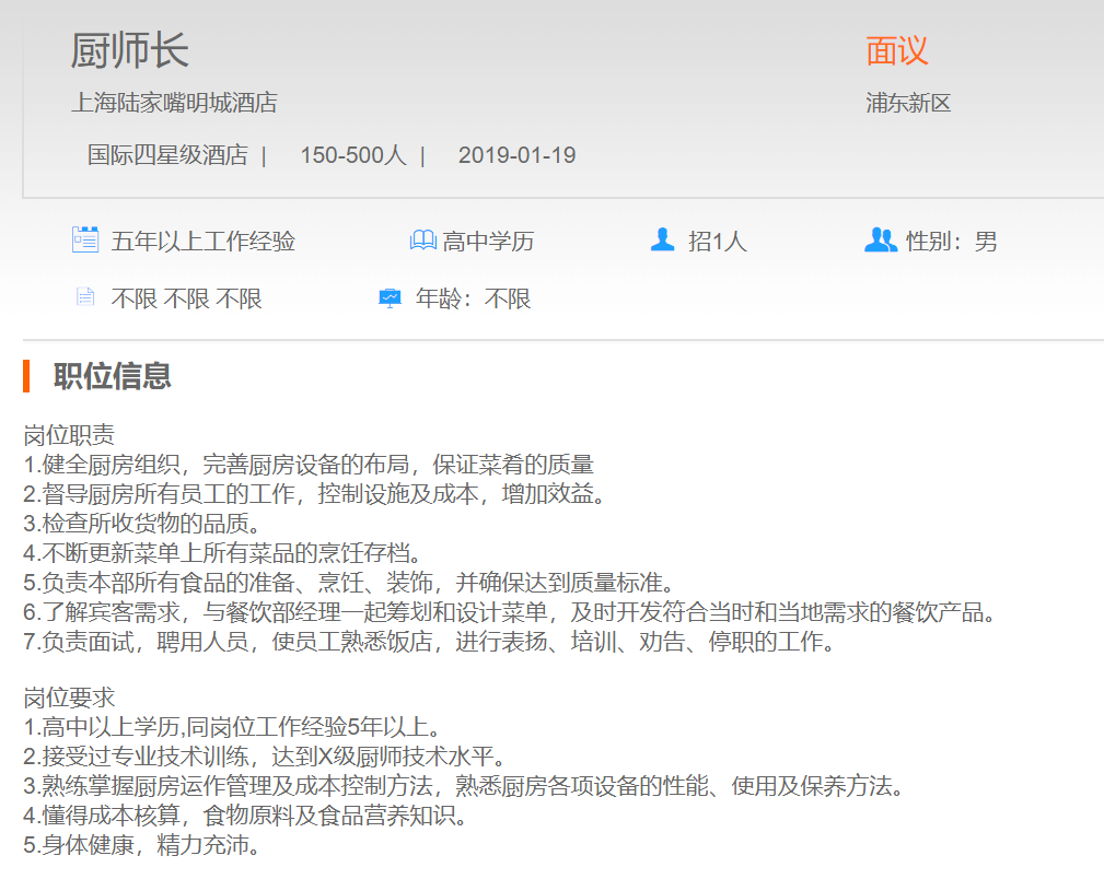 上海陆家嘴明城酒店厨师长
