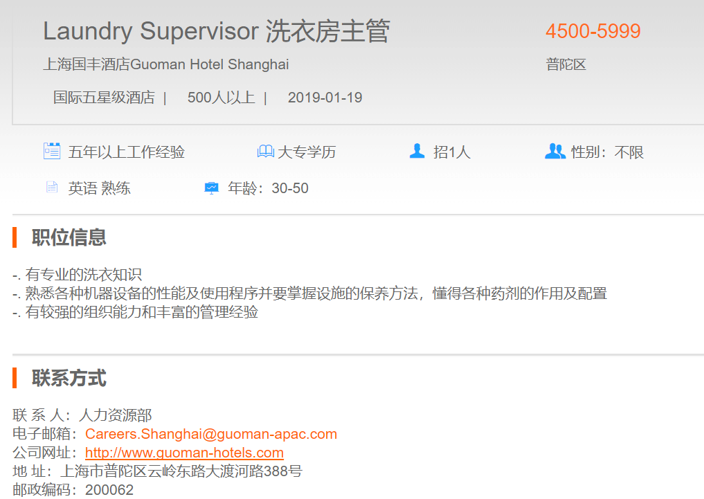 上海国丰酒店洗衣房主管