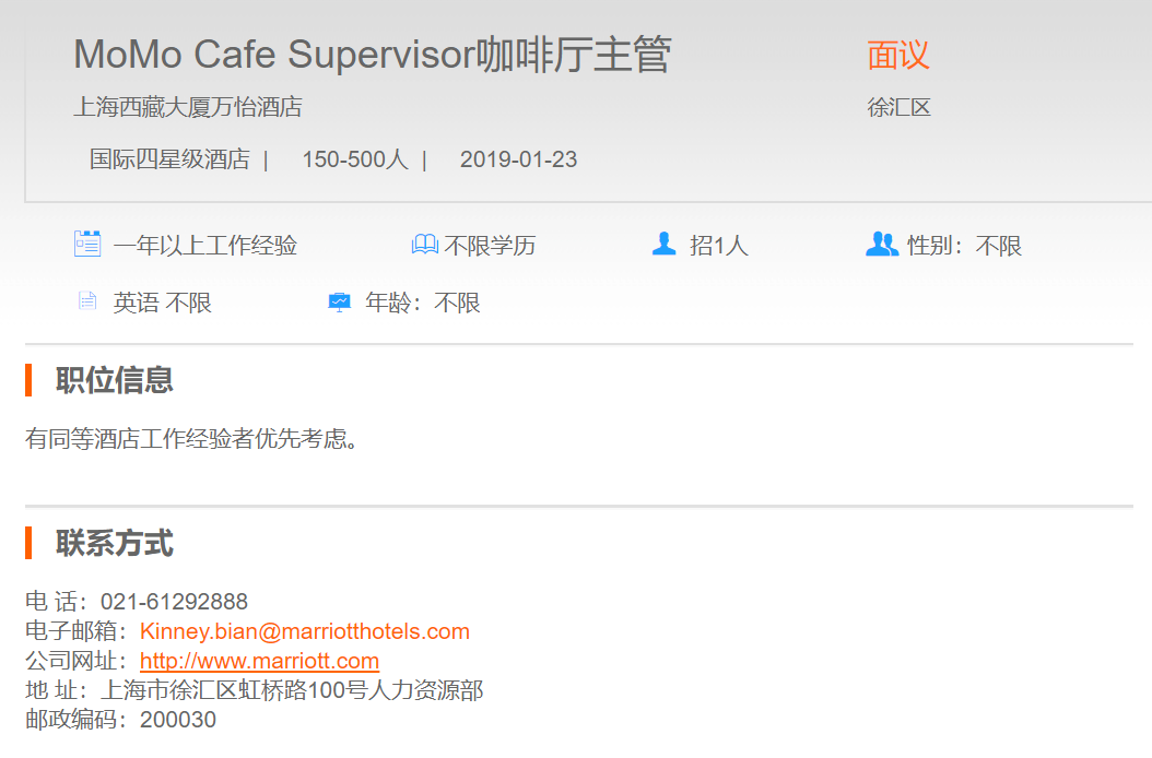 上海西藏大厦万怡酒店咖啡厅主管