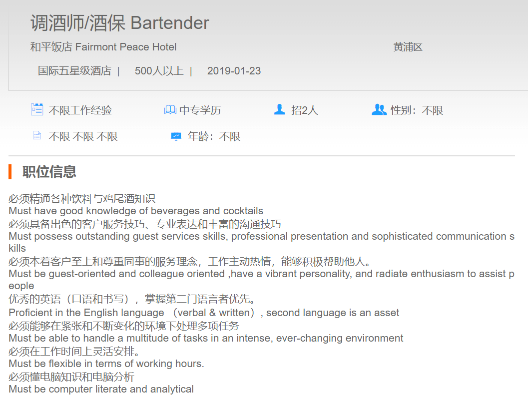和平饭店调酒师|酒保