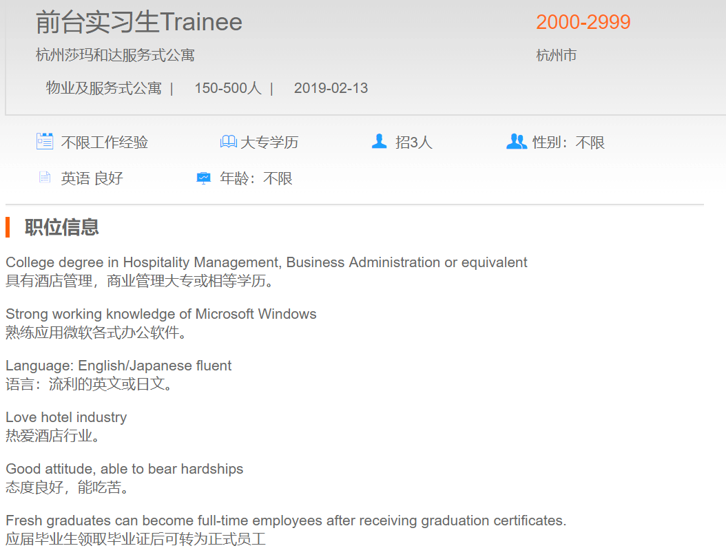 杭州莎玛和达服务式公寓前台实习生