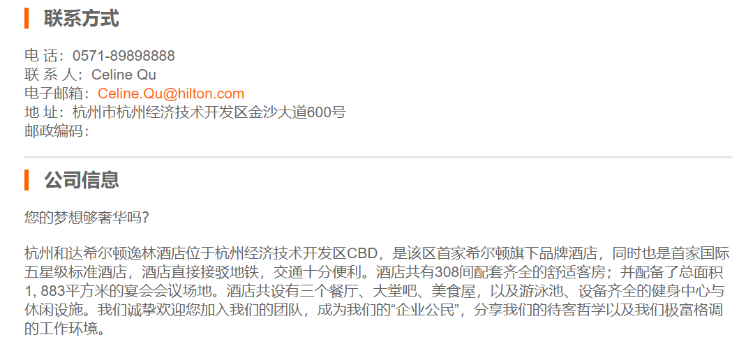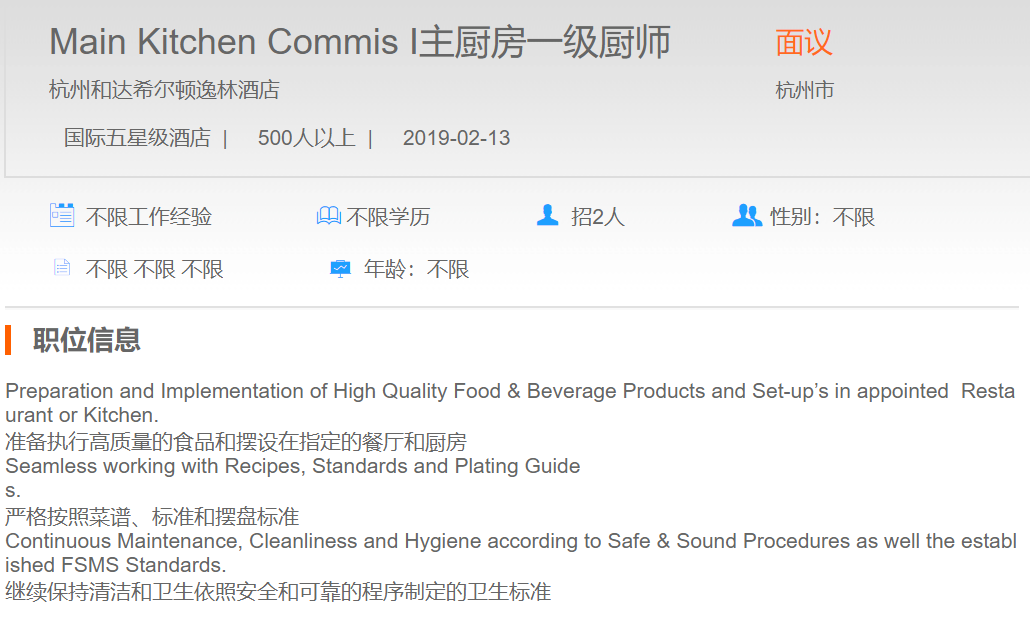 杭州和达希尔顿逸林酒店主厨房一级厨师